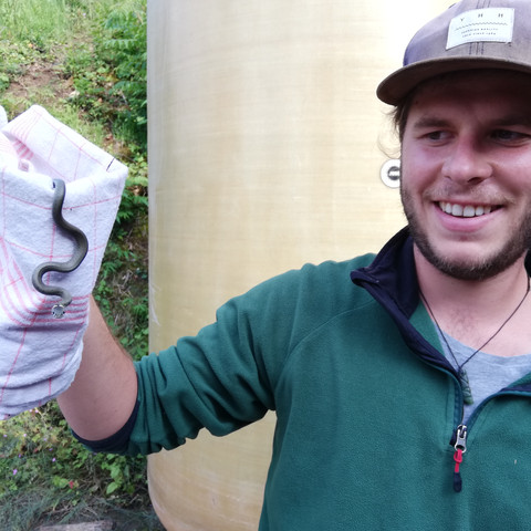 Unser Sohn und Winzer Maximilian hält eine Ringelnatter in die Kamera. Danach darf sie sich natürlich wieder in das Buschwerk schlängeln.